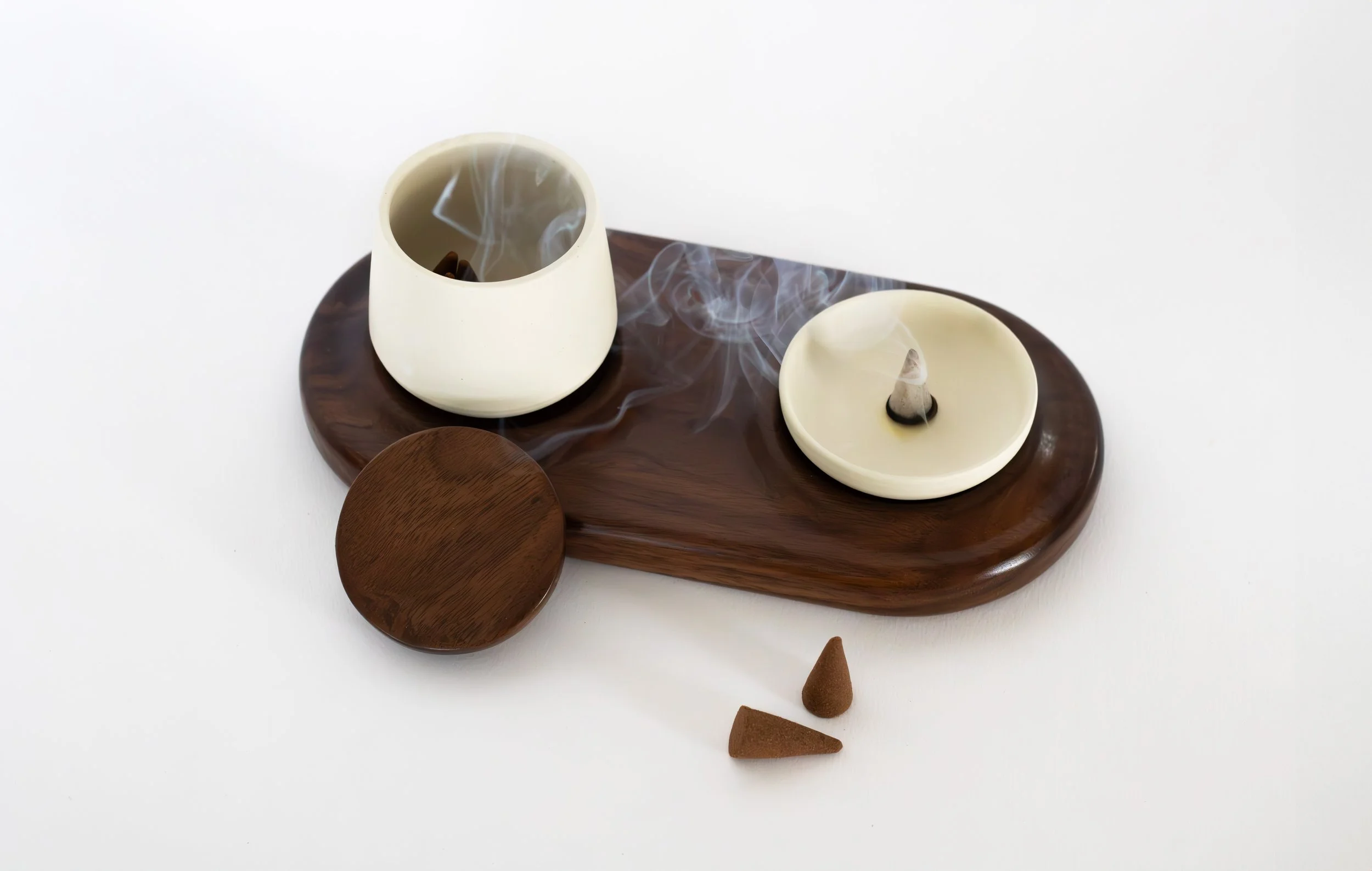 The cone incense burner set features a walnut base and two ceramic pieces. The short piece is designed for burning the incense cones, offering a stable surface. The other is a container to store and organise unused incense cones, keeping them easily accessible. This unique design blends practicality with elegance, enhancing any room's ambiance.